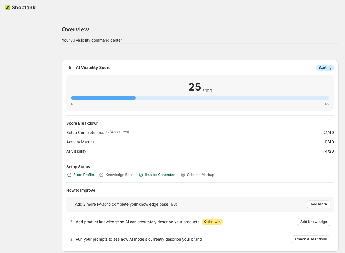 Shopify gives you the infrastructure to participate in AI commerce. Shoptank gives you the tools to compete in it. The merchants who understand this distinction and act on it now will build a discovery advantage over competitors who are waiting for Shopify to solve the whole problem natively.