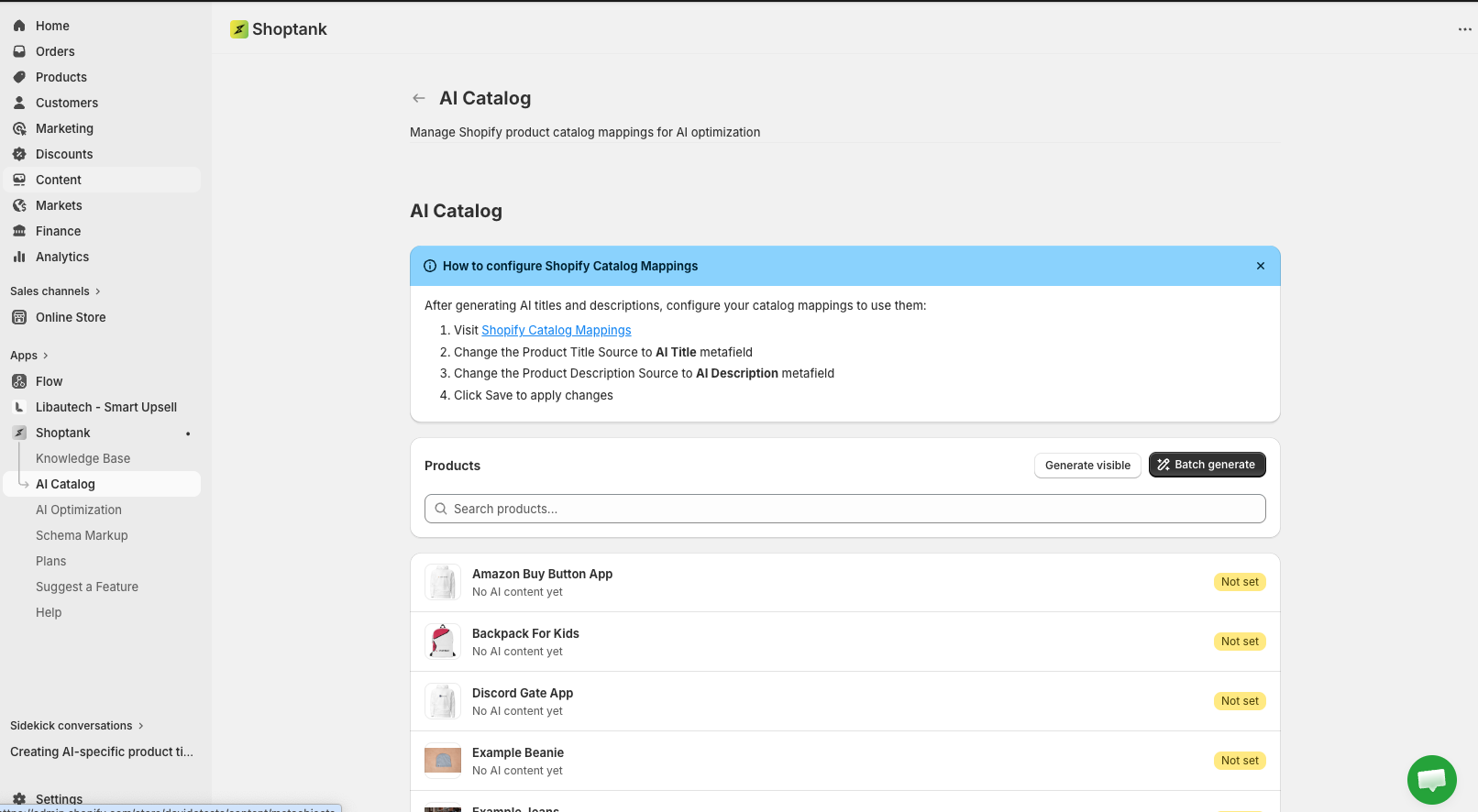 Shoptank includes a batch generate feature that uses AI to create optimized titles and descriptions for your entire catalog at once. Press batch generate and the app processes all your products automatically. The generated content is structured to be more likely recommended by AI assistants.